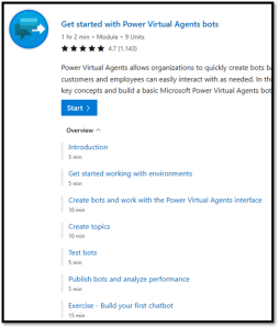 Get started creating bots with Power Virtual Agents. This Learning Path introduces you to creating bots. You’ll be introduced to important concepts such as how to create topics that will be used to drive conversations.