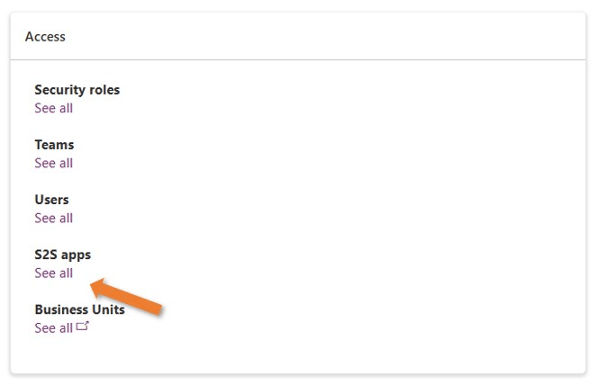 Step 6: We need to add our new app registration to our environment. In the Power Platform Admin Center, click on the Environments tab in the left pane and click the environment you’d like to access Dataverse in. On the right side of the screen under Access, you should see a button for S2S apps. These are server-to-server authenticated apps that communicate between your web apps and Dataverse.