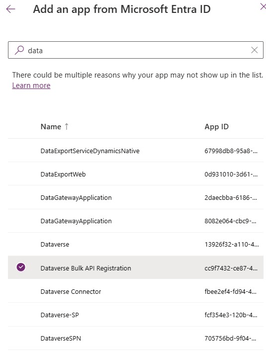 At the top of the screen, select + New app user. In the pane that opens on the right side of the screen, select + Add an app and search for the app you just registered in Entra ID. The App ID should match the Application (client) ID you have on your Notepad. Select a business unit and the System Administrator role, or any role with correct permissions to that data, for that app. Click Create and your app now has access to Dataverse in that environment!
