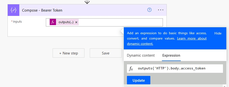 Step 2: That HTTP POST call will return an access token for us. We can parse that token as an expression using a Compose action: