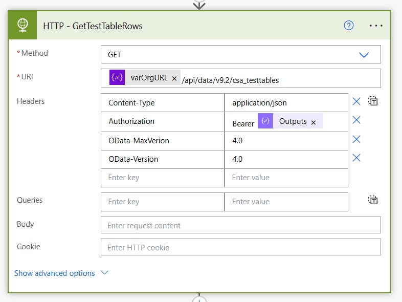 Method: GETURI: {organization URL}/api/data/v9.2/{logical table name}Headers: Content-Type = application/json Authorization = Bearer {outputs of your bearer token Compose action} OData-MaxVersion = 4.0 OData-Version = 4.0