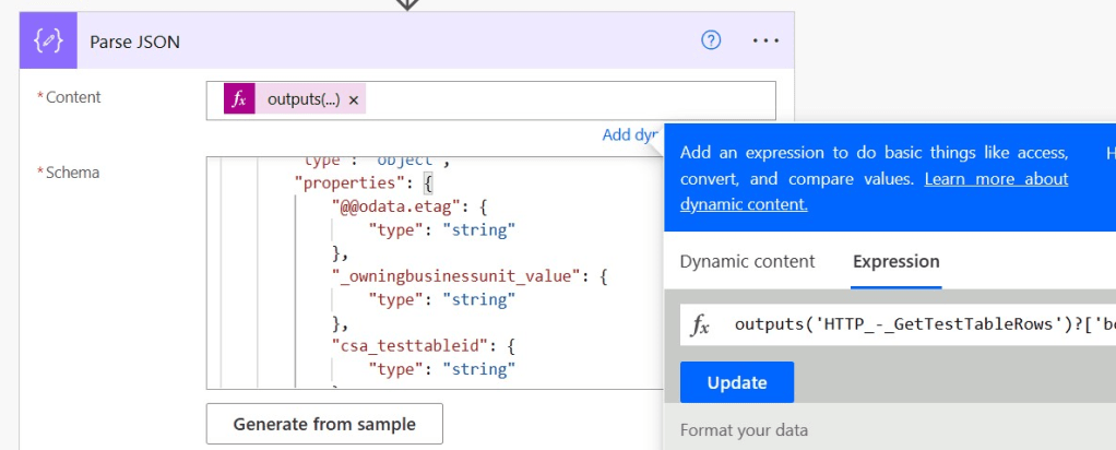 Step 2: You can use a Parse JSON action to get data from the response of that HTTP call. If you named your HTTP action what I did above, it would look like this as an expression: