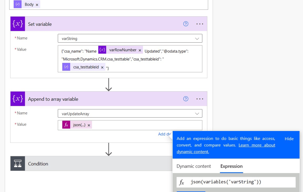 Step 3: I looped through every line of that data and added the columns I wanted to objects in an array. You need the logical name of your columns, which can be found in the column properties in Dataverse. In my case, the Name column was actually csa_name. The important part is making sure you grab the primary key of that table (usually the name of the table itself in Dataverse) when updating rows in that table so the update call knows which rows to update. In my case, that was the csa_testtableid column. I added these to the array inside an Apply to each loop that when through the responses from that GET HTTP call we made earlier. One of these objects in the array may look like this: