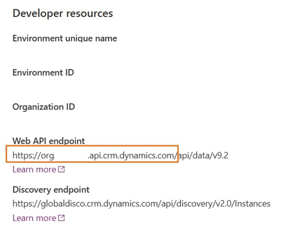 Step 2: In another tab, visit the Power Apps site for your tenant and navigate to the environment you are trying to access data from. Click on the cog in the upper right corner of the screen and select Developer resources. In the pane that opens on the right side of your screen, you will see the Web API endpoint for that environment. Copy the URL through .com and paste it somewhere like Notepad as any good developer would do for safekeeping.