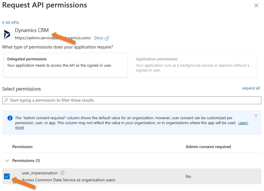 Step 3: In the left pane, select API permissions and click + Add a permission. In the pane that opens on the right side of the screen, you want to select Dynamics CRM and select the user_impersonation option under permissions.