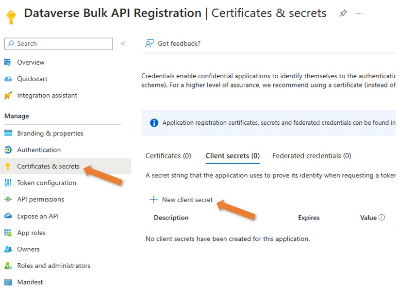 Step 4: Click on Certificates & secrets in the left pane. Select + New client secret under the client secrets tab. Give your secret a super cool name and when it should expire. After creating, copy the value of the secret (not the Secret ID). Paste that on your Notepad from earlier.