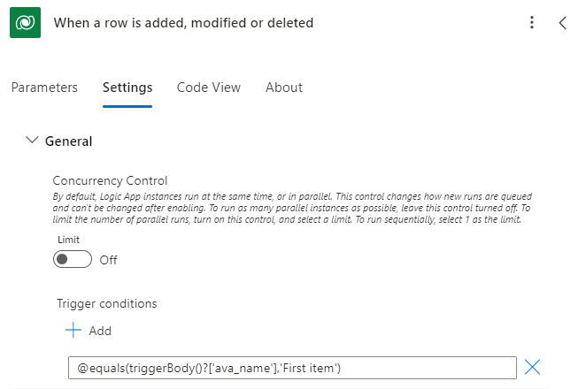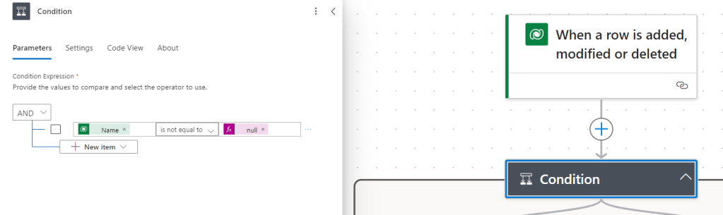 That’s your trigger condition! You can add it back into your trigger condition section in the trigger “Settings” and now your flow will only trigger when someone creates an item with the Name “First item”.