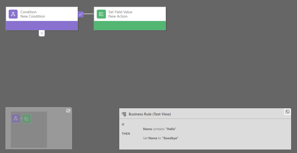 This would only trigger if the table “Name” column contains “Hello”. Maybe you would convert that field to something else after the fact with a business rule: