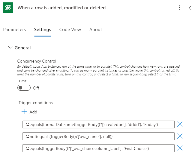 Trigger conditions ensure your flows will only trigger if a specific condition is met. For example, maybe you only want your flow to trigger if a field in Dataverse is equal to true. Maybe you only want your flow to trigger on changes that happen between 5PM and 7AM the next day so you can get a list of changes that happened overnight. Maybe you only want your flow to trigger if some field is greater than another field and some other field is equal to true and some other field is equal to false or null and some other field contains some string. The world is your oyster here.