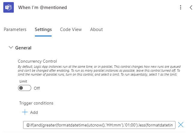 You can use this trigger condition for any trigger that accepts trigger conditions. Maybe you only want this for messages you’re mentioned in a channel on Teams in that window: