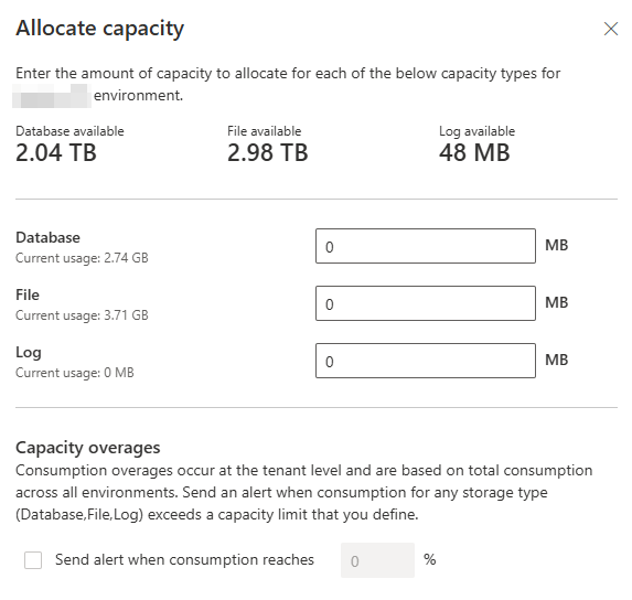- In the Allocate capacity pane, view the currently allocated and consumed capacity for the environment.