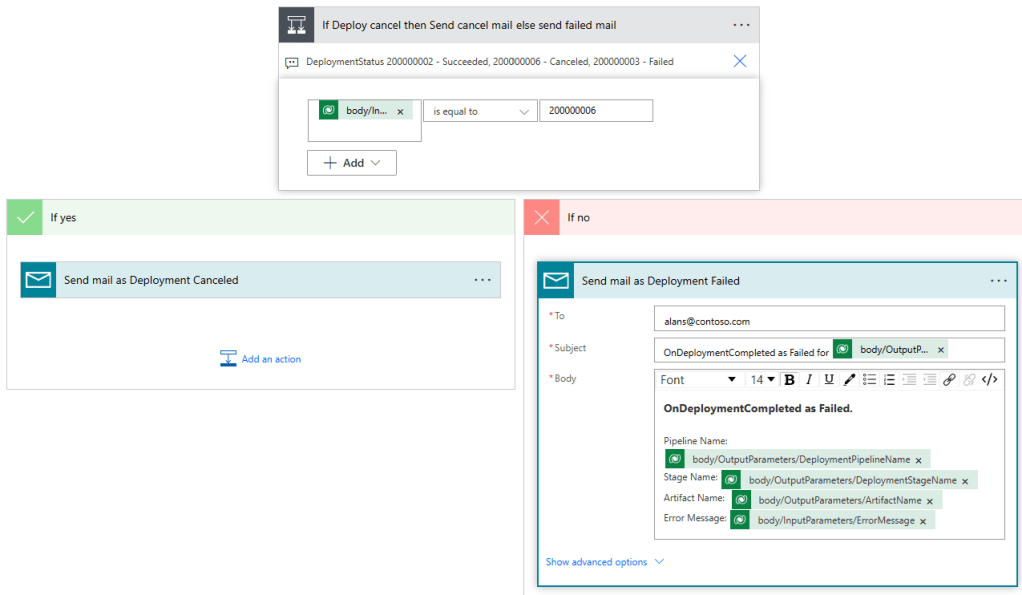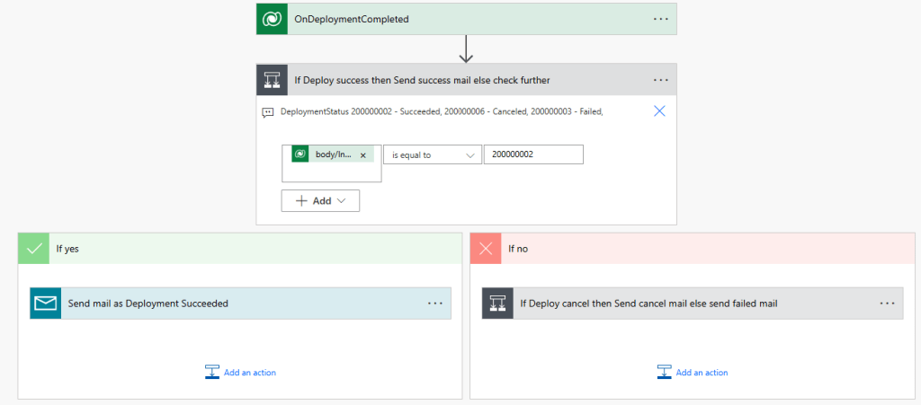 This Power Automate flow checks if a deployment was successful or not. If successful, or yes in the image above, it sends an email. If not, if checks to see if the deployment was cancelled or failed.